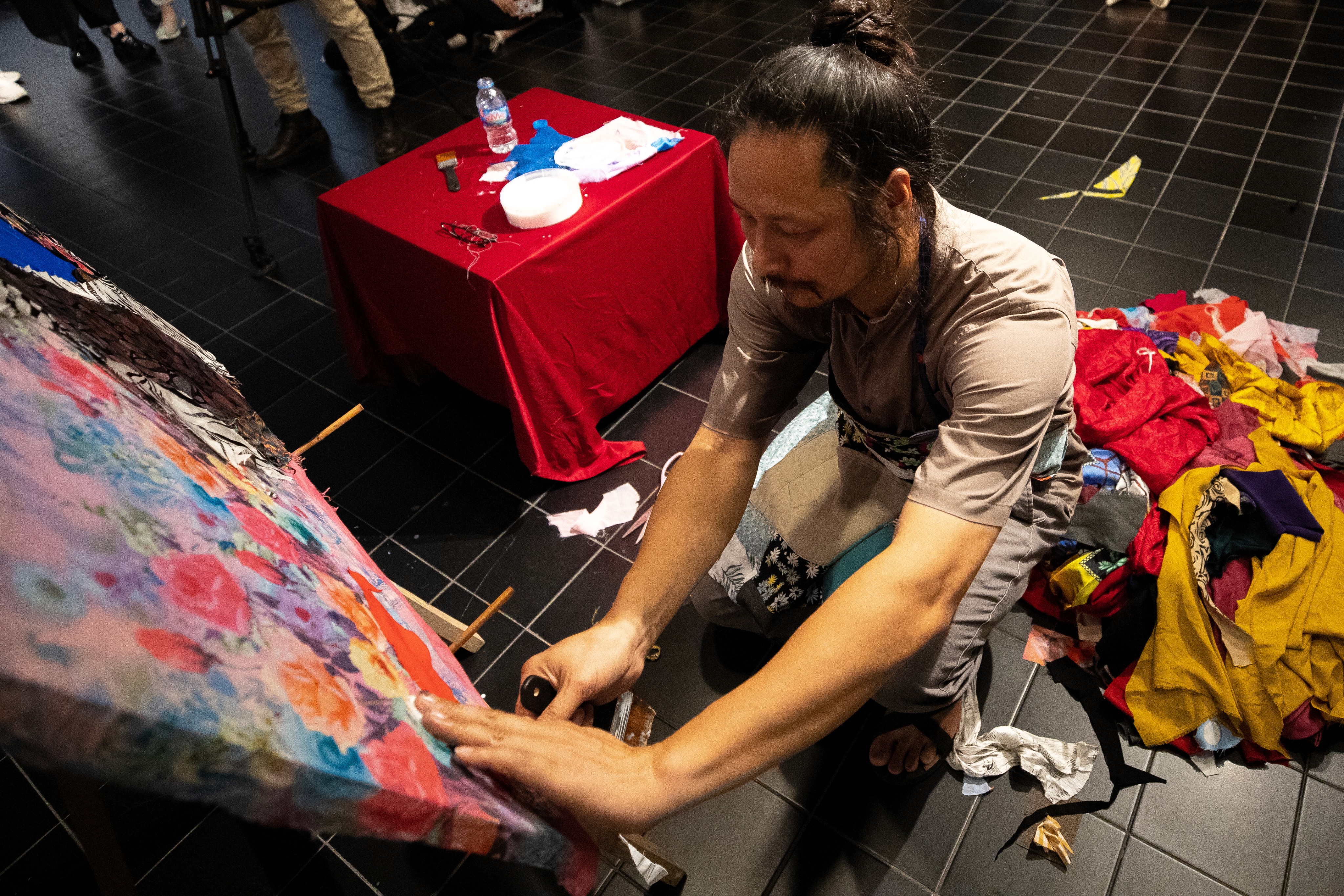 Artist Thái Tĩnh used recycled fabric to create a painting at the opening ceremony | 22.7.2023