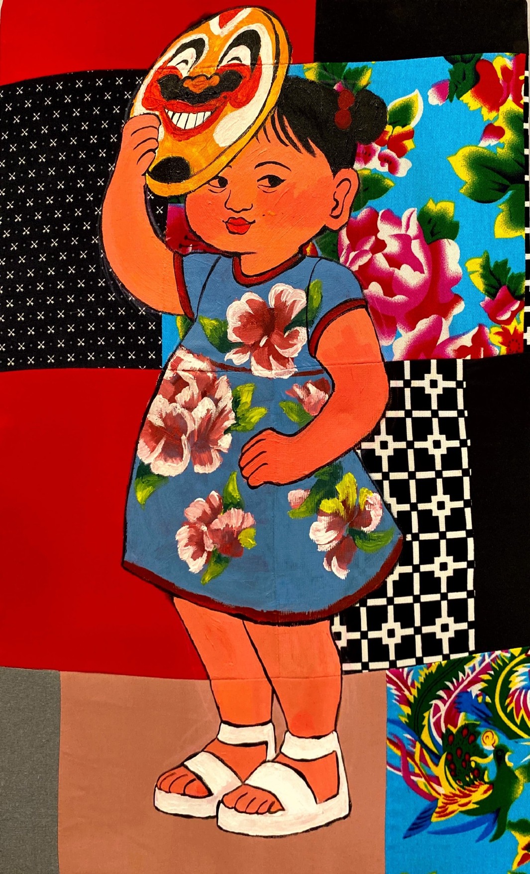 The image of a character dancing in scattered pieces of fabric represents the cultural capital struggling in an era of industrial development. It longs to be like the clouds, escaping from the confines of a four-sided box.