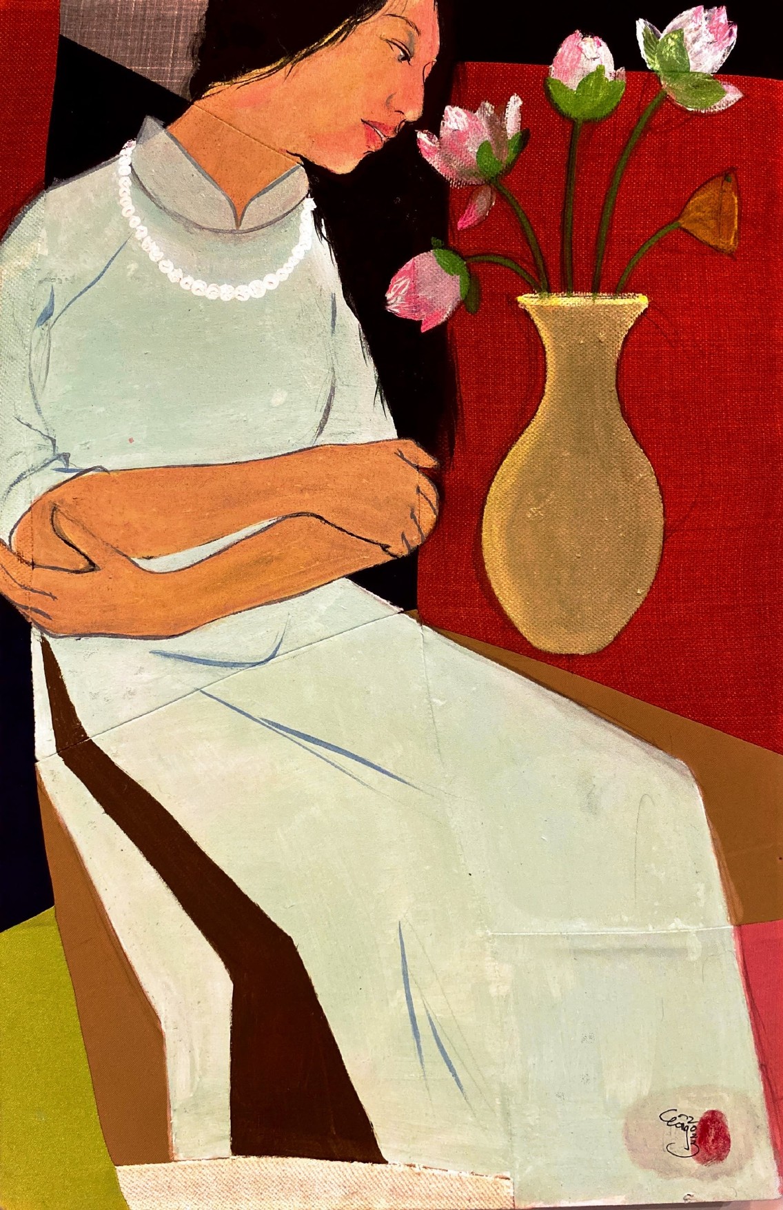 The elegant and exquisite beauty of Hanoi is portrayed via the image of a woman in her white Ao Dai, sitting contemplatively, enjoying the fragrance of the first-season lotus flower. The artwork aims to revive the beauty of traditional values (the Ao Dai, the graceful and delicate nature of Hanoi's young women).